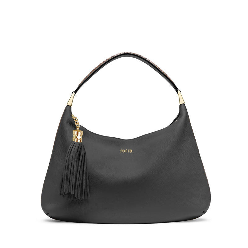 Ручка и торцевые стороны сумки украшены плетеными вставками ручной работы из кожи темно-коричневого цвета .