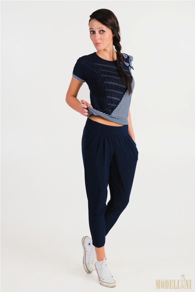 Описание: Блуза женская изготовлена из вискозы и выполнена с коротким цельнокроенным рукавом с манжетами и ассиметричной передней полочкой. Блуза декорирована стразами и бантиками. Очень удобный вариант в сочетании с брюками, юбками или капри. Для изготовления блузы использована однотонная вискоза синего цвета и вискоза с рисунком полоска. Длина изделия увеличивается от размера к размеру и достигает середины бедра на большие размеры.
