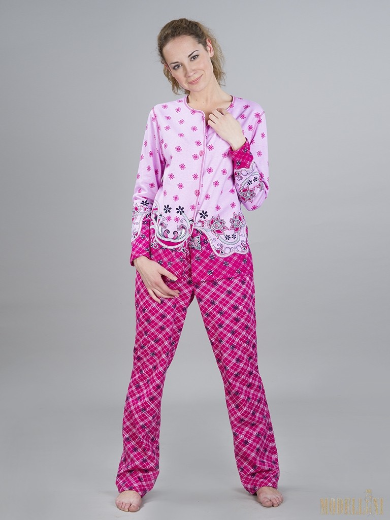 Описание: Теплая пижама выполнена из футера с начесом из расцветок малина и бирюза (купон+партнер набивка). Пижама состоит из кофты на пуговицах и брюк на поясе с резинкой. В такой пижамке Вам будет тепло в осенние и зимние вечера и ночи. Расцветки: малина и бирюза