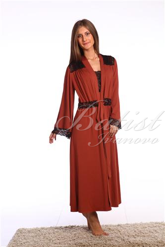 Халат <<в стык>>, прямого силуэта, длиной до середины икры. Кокетки переда и спинки, кулиса выполнены из эластичного кружева. В кулису продет пояс. Части пояса завязываются в мягкий бант. Рукав втачной, длинный. Низ рукава обработан эластичным кружевом. Срезы борта обработаны планкой.