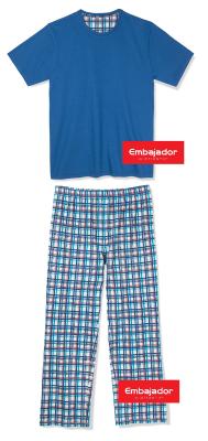Пижама мужская: Футболка с коротким рукавом и круглым вырезом горловины, однотонная. Брюки длинные, на резинке, с контрастным принтом "в клетку".