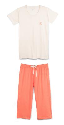 Комплект пижамы женской: Футболка с коротким рукавом и круглым вырезом горловины. Бриджи на резинке с завязками.