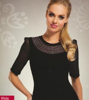 Блузка с короткими рукавами "Фонарики" до локтя из микросетки, на передней части изделия вставка по горловине со стразами из микросетки.