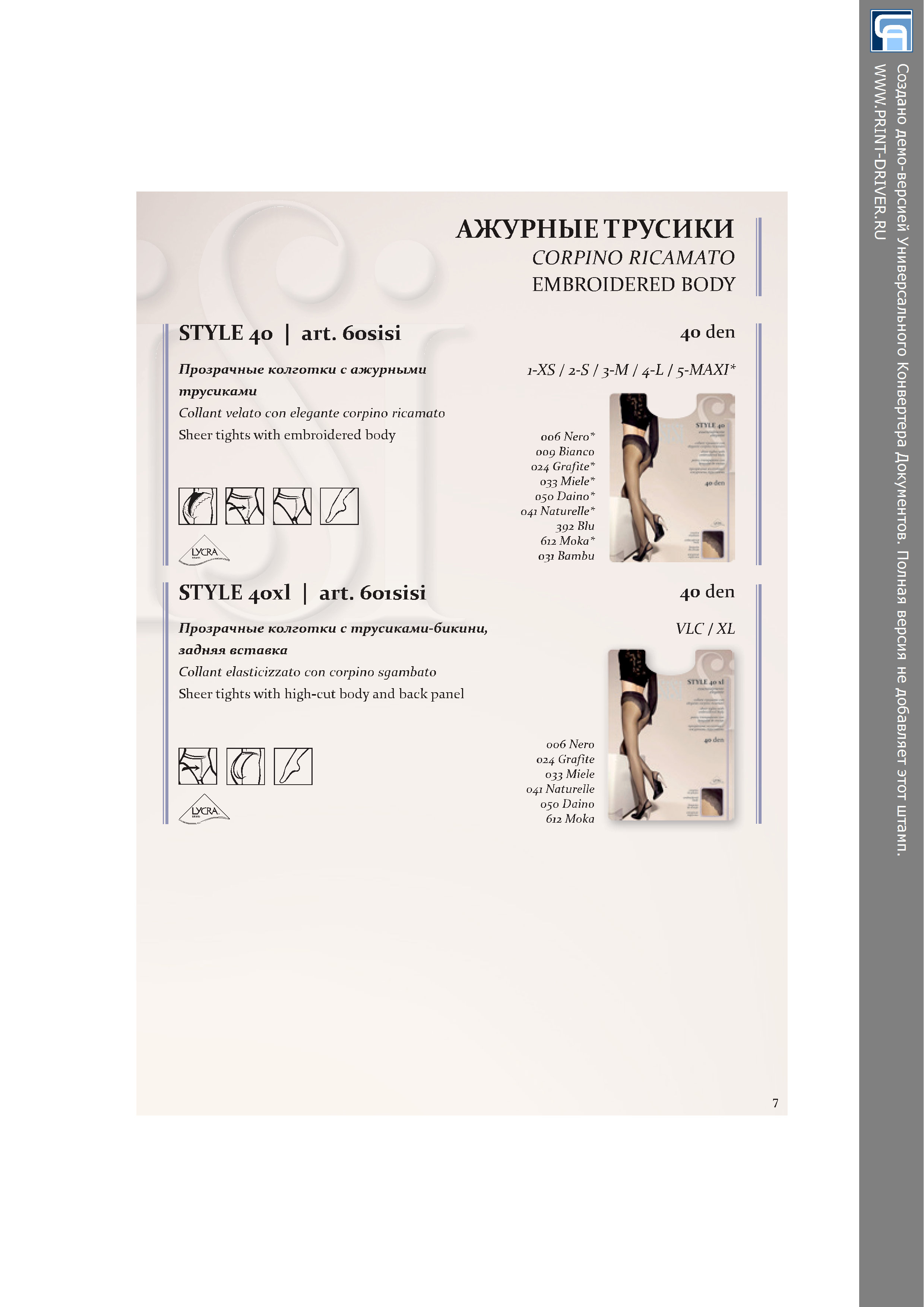 bianco (белый) daino (бежевый) Graffite (тёмно-серый) miele (легкий загар) moca (коричневый) naturel (телесный натуральный) nero (чёрный) Размер: