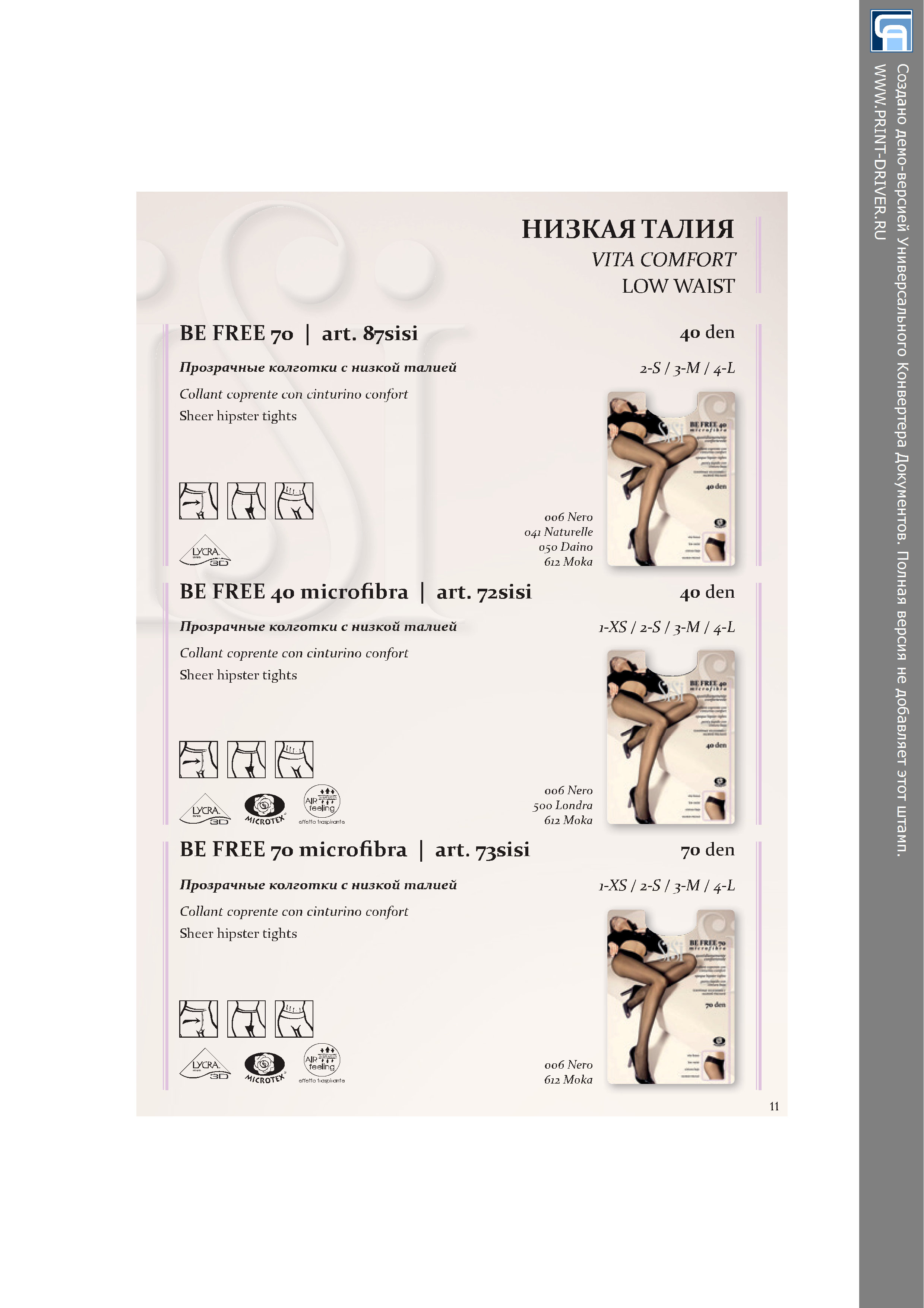 Равномерные, матовые колготки, с заниженной талией и широким мягким поясом; плоские швы, сформированная ступня, невидимый мысок, х/б ластовица.
