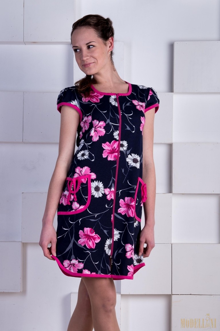 Описание: Халат женский на молнии из набивной кулирки новых ярких расцветок. Халат выполнен с коротким рукавом, накладными карманами.