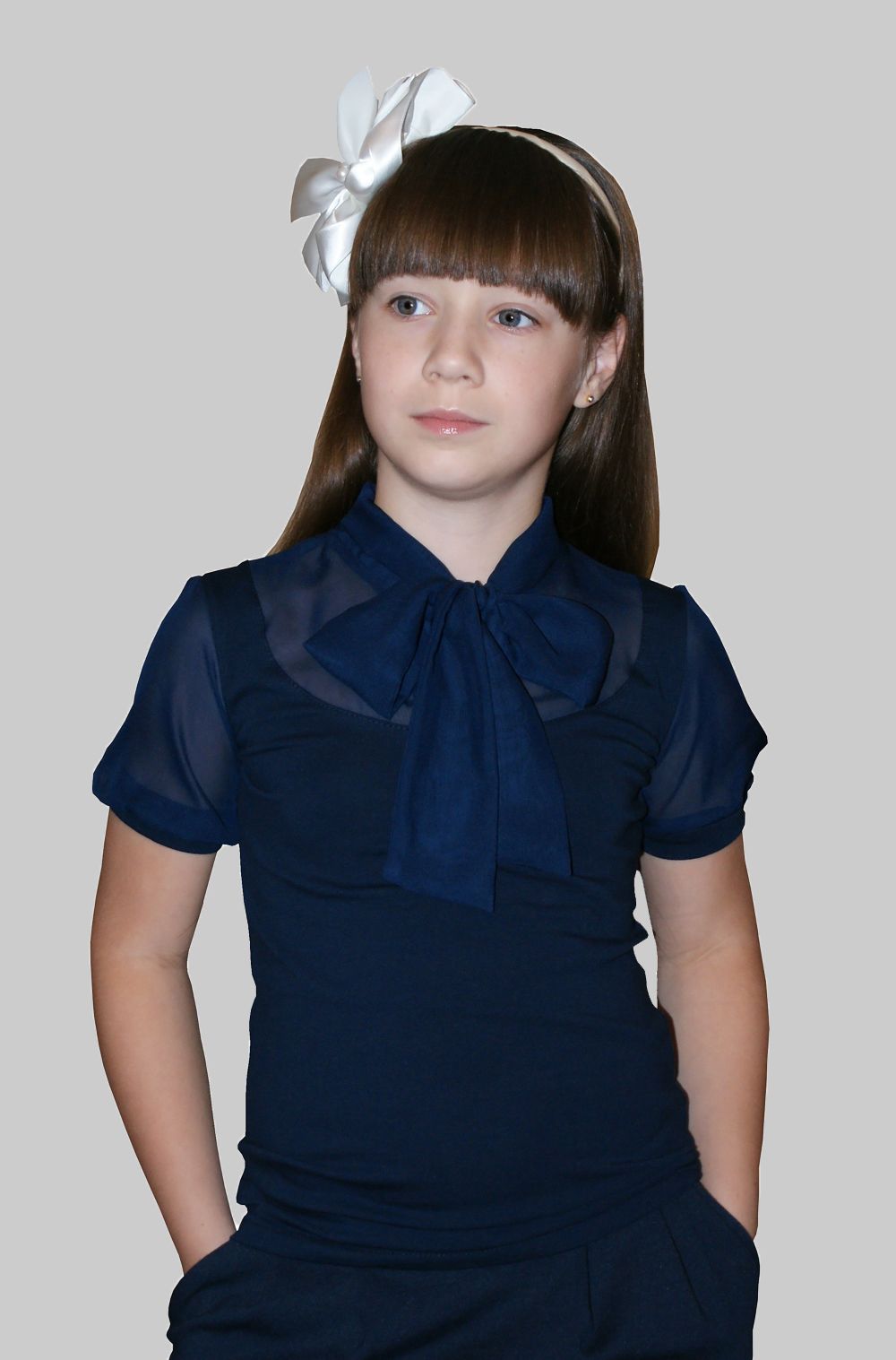 Блузка нарядная для школы с коротким рукавом. Блузка из мягкого трикотажная на девочку, рукава и кокетка из шифона , воротник стойка завязывается бантом.