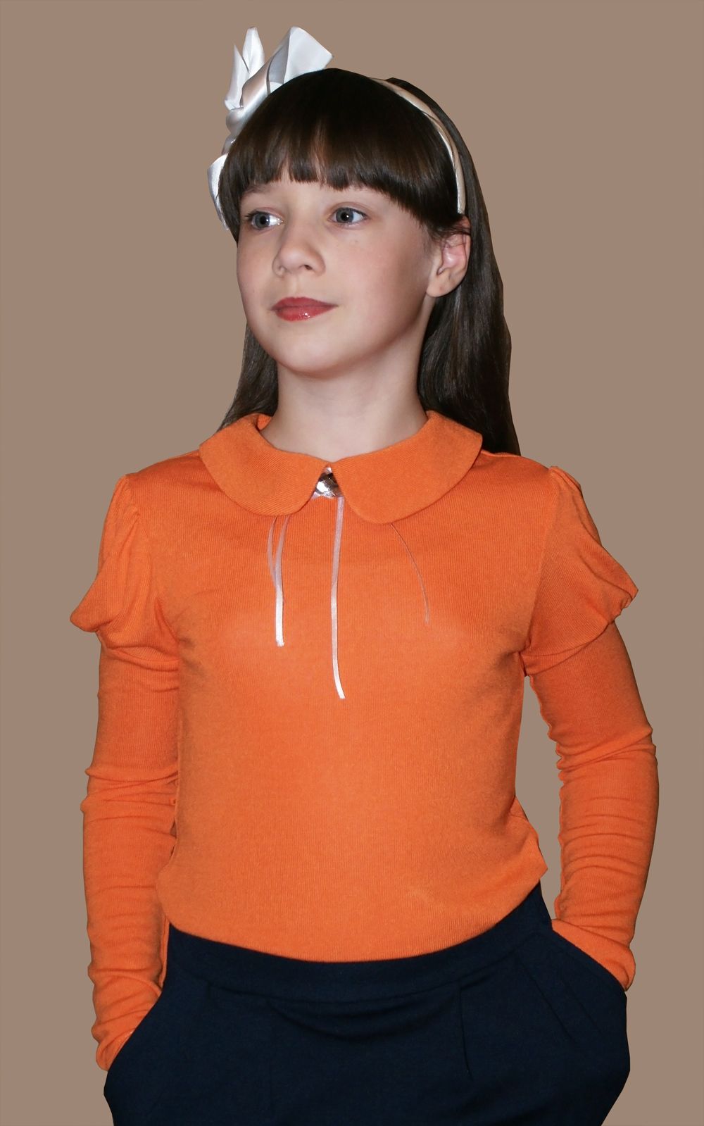 Блузка из мягкого трикотажа, с длинным рукавом, нижняя часть из кружева. Воротник отложной украшен кристалом. На спинке шов с застежкой на пуговицу. Удобный силуэт позволит комфортно себя чувствовать. Можно использовать как для торжественного случая так и на каждый день.