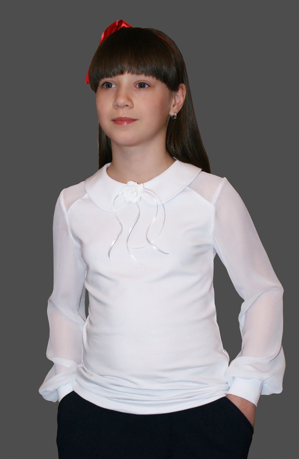 Блузка нарядная для девочек из высококачественного трикотажа(кулирка качество пенье). Блузка с отложным воротником и застежкой сзади. Рукава и кокетка выполнены из шифона. Блузка украшена брошкой- розочка. Трикотажная блузка не деформируется после стирки, очень удобна и комфортна для вашего ребенка.