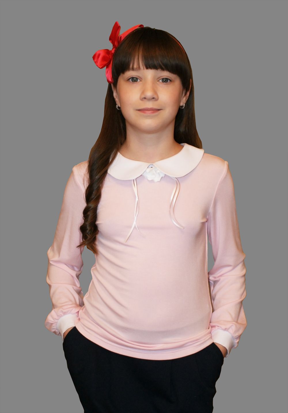 Блузка для девочек, выполнена из мягкого трикотажного полотна. Блузка полуприлегающая, можно носить как заправленную в пояс так и на выпуск. Длиный рукав с низу на манжете. Воротник отложной сзади на застежке. Блузка декорирована брошкой розочка на булавке. Отличный вариант для школы и для торжественного случая.