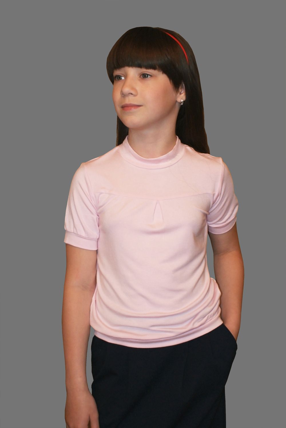 Джемпер для девочек, выполнена из мягкого трикотажного полотна. Джемпер свободный, по низу пояс. Короткий рукав фонарик с низу на манжете. Отличный вариант для школы и для торжественного случая.