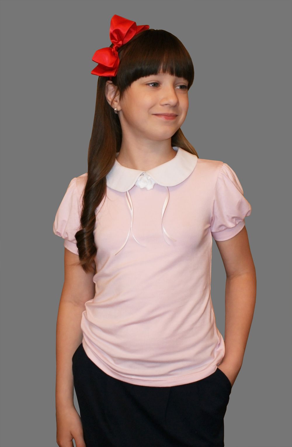Блузка для девочек, выполнена из мягкого трикотажного полотна. Блузка полуприлегающая, можно носить как заправленную в пояс так и на выпуск. Короткий рукав фонарик с низу на манжете. Воротник отложной сзади на застежке. Блузка декорирована брошкой розочка на булавке. Отличный вариант для школы и для торжественного случая.