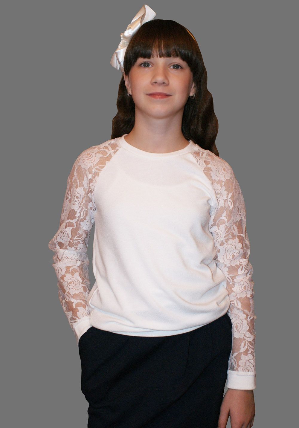 Джемпер для девочек, выполнен из мягкого трикотажа. Полочка комбинирована, рукава из кружева. Джемпер свободный на выпуск, по низу пояс.
