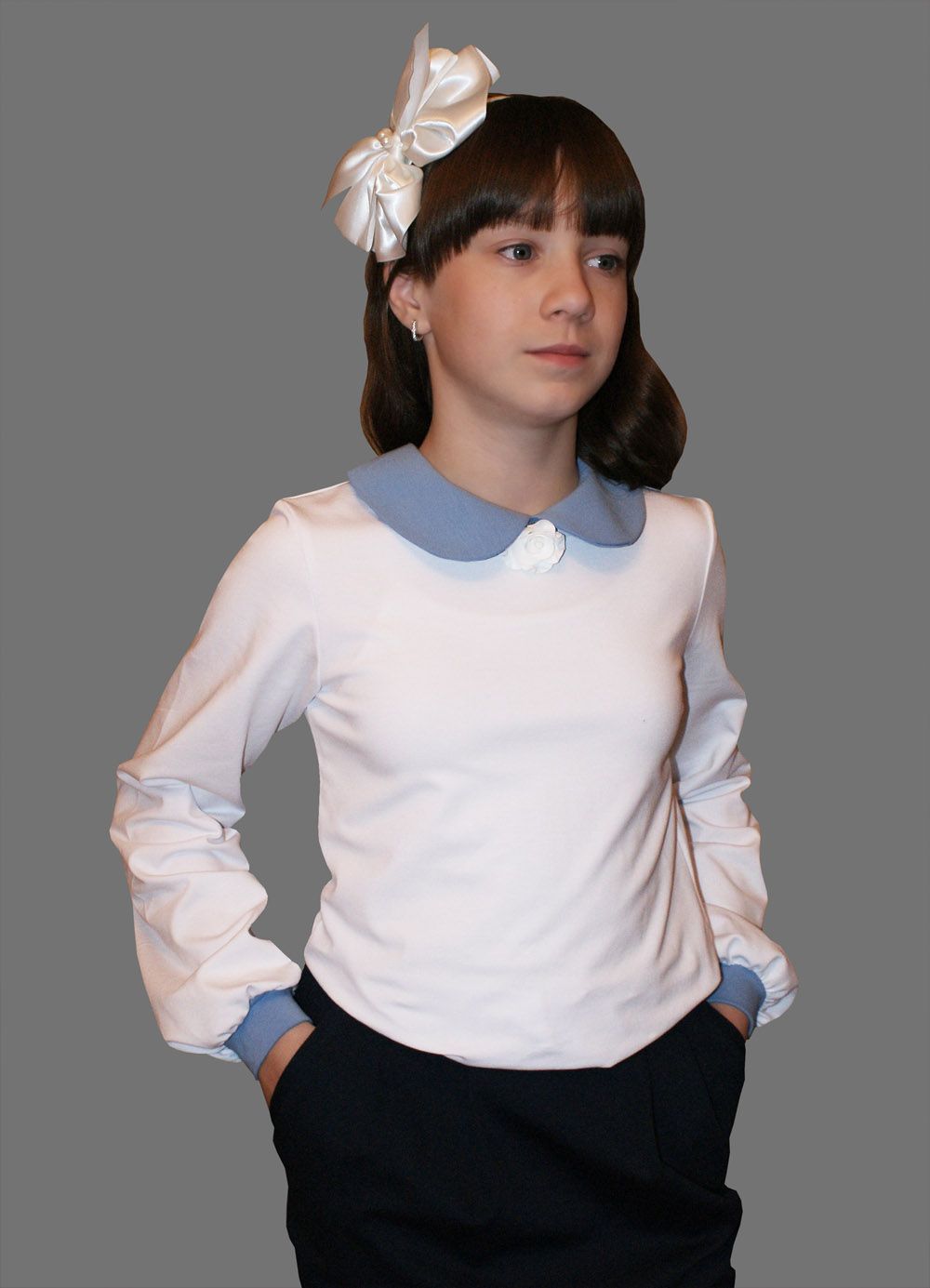Блузка для девочек, выполнена из мягкого трикотажного полотна. Блузка полуприлегающая, можно носить как заправленную в пояс так и на выпуск. Длиный рукав с низу на манжете. Воротник отложной сзади на застежке. Блузка декорирована брошкой розочка на булавке. Отличный вариант для школы и для торжественного случая.