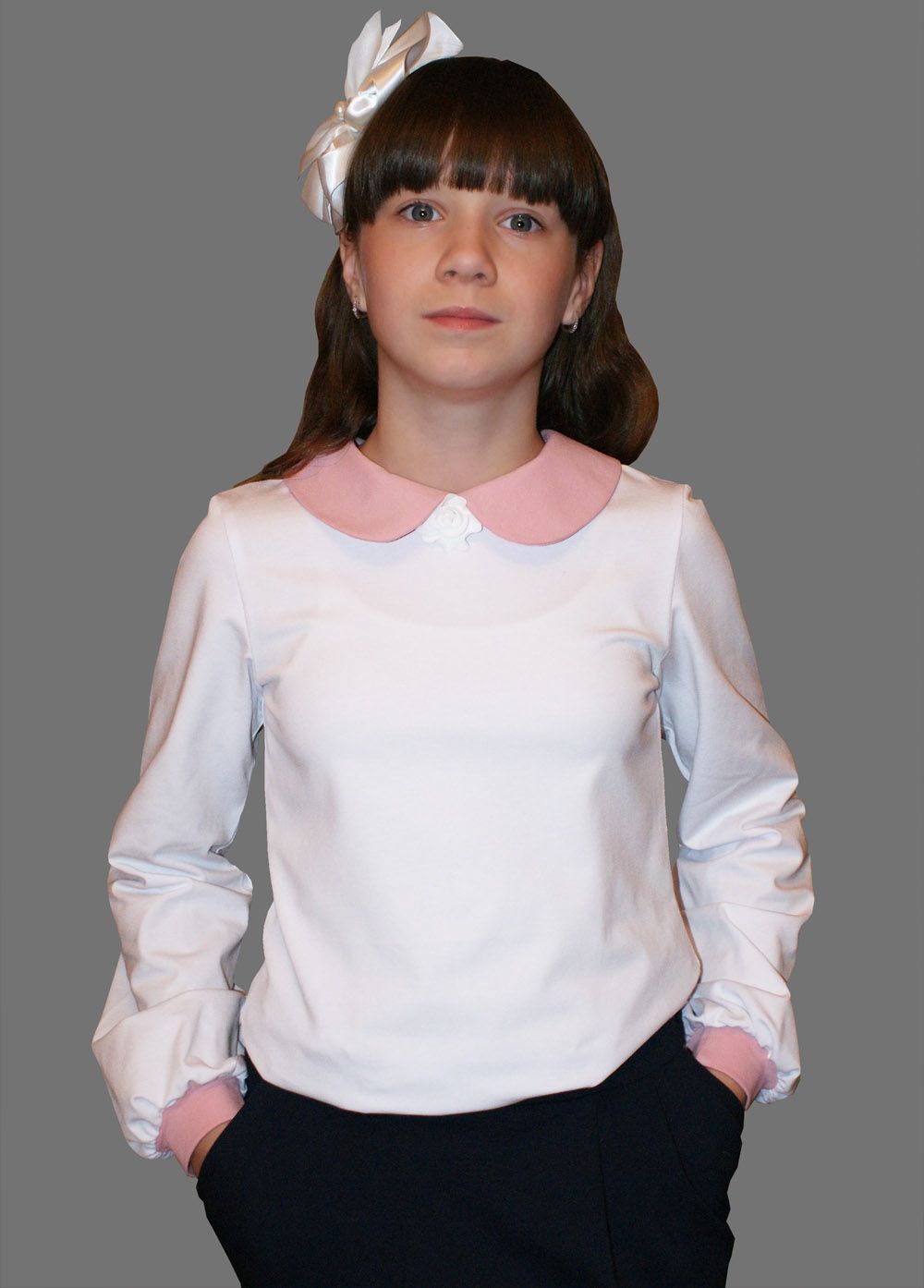 Блузка для девочек, выполнена из мягкого трикотажного полотна. Блузка полуприлегающая, можно носить как заправленную в пояс так и на выпуск. Длиный рукав с низу на манжете. Воротник отложной сзади на застежке. Блузка декорирована брошкой розочка на булавке. Отличный вариант для школы и для торжественного случая.